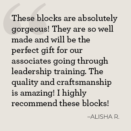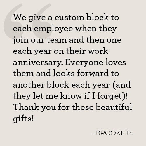 We give a gift to our staff for their one year anniversary, and they love getting our core value blocks! They look great.