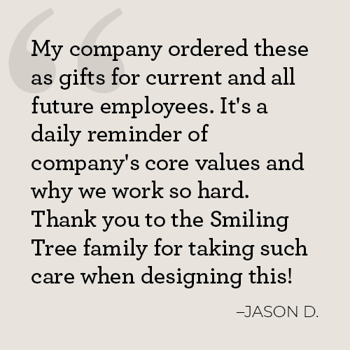 I am so glad I stumbled upon Sniling Tree gifts —our staff love the Core Value Blocks, which is now our standard 5-year anniversary gift. Good service is essential to me, and the service has been incredible. The owners/staff are kind, very responsive, and they have a fast turnover for a customer product!