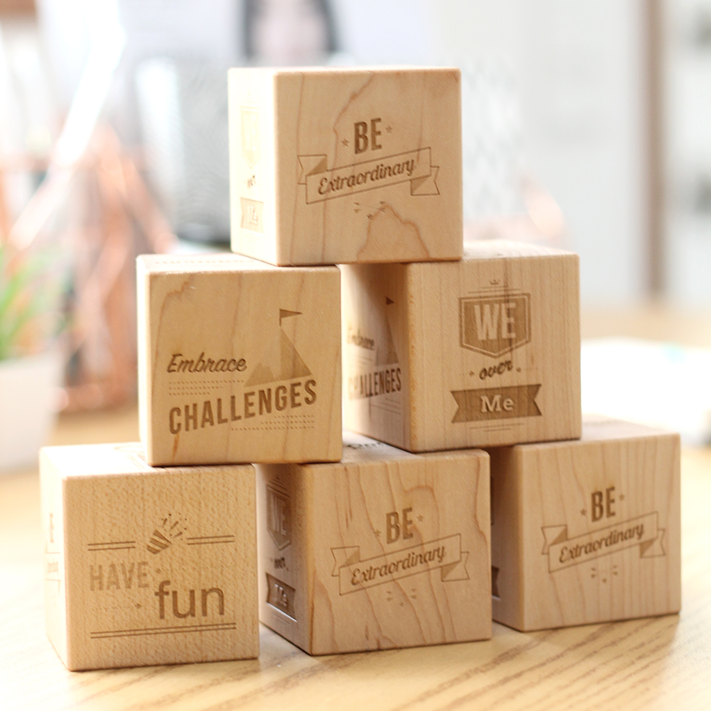 We give a gift to our staff for their one year anniversary, and they love getting our core value blocks! They look great.