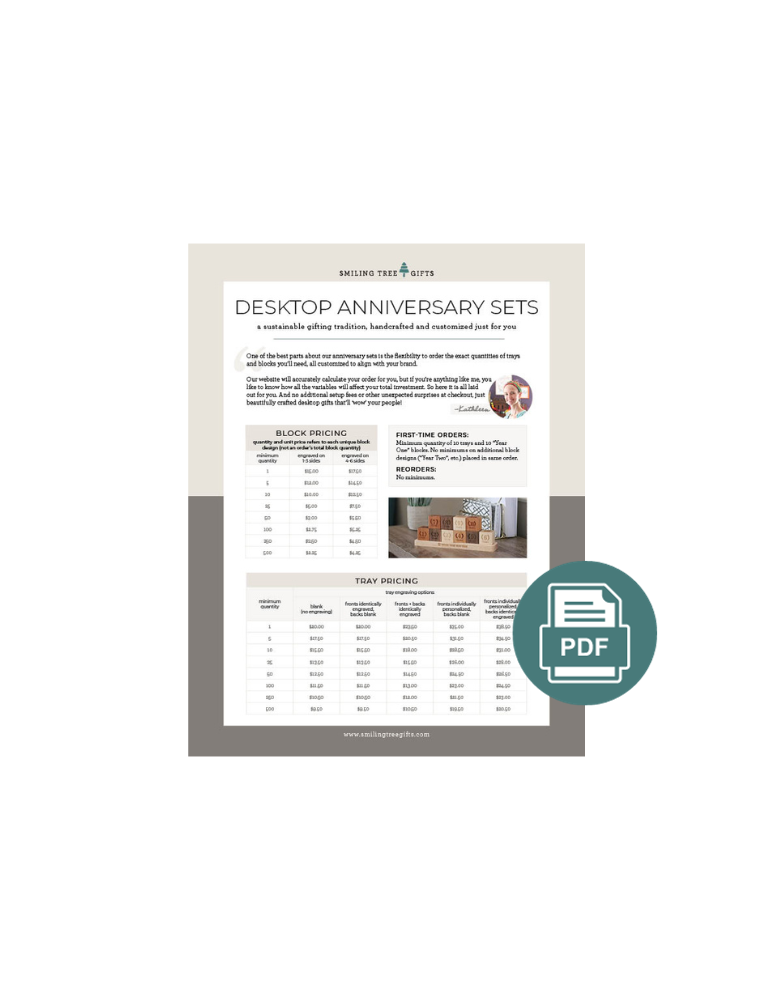 Start a tradition your employees will love displaying on their desks. Our signature Anniversary Wood Block and Tray Sets showcase employee loyalty and brand design in a way like no other. Best of all? Your team will wholeheartedly agree.